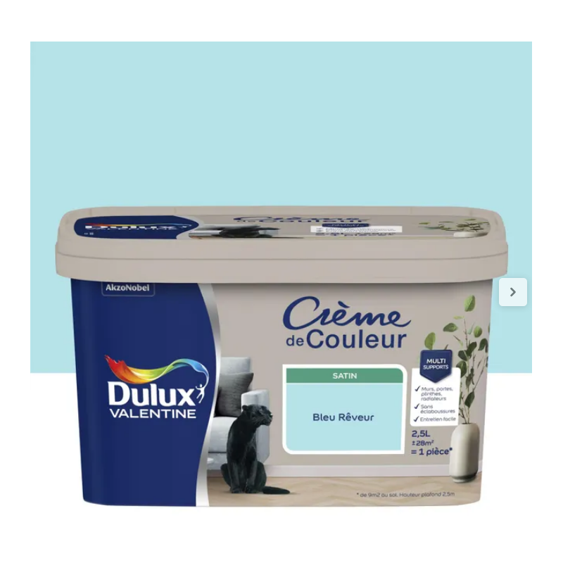 > Peinture mur, boiserie bleu rêveur satin DULUX VALENTINE Crème de couleur 2.5l