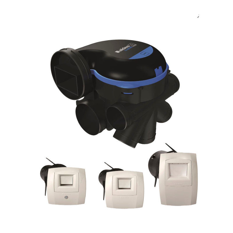 Kit VMC simple flux hygroréglable EasyHOME HYGRO Premium MW' pour pieuvriste avec moteur Micro Watt EC pour plus d'économie d'énergie et livré avec 3 bouches BAHIA CURVE.